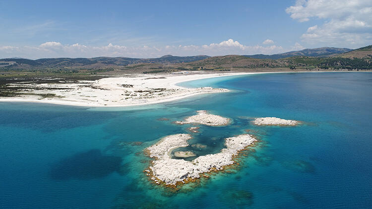 Turkuaz mavisi suyu ve beyaz kumsalı ile 'Türkiye'nin Maldivleri' olarak bilinen Salda Gölü'nün suyu, kuraklık nedeniyle 30 metre...